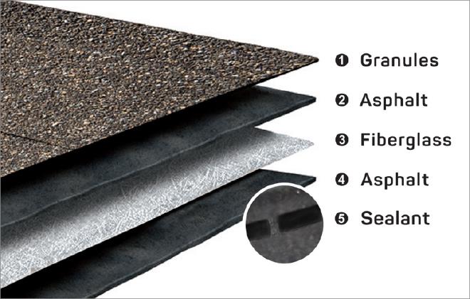 This excellent graphic we have borrowed from IKO that shows a breakdown of what Asphalt shingles are made of.